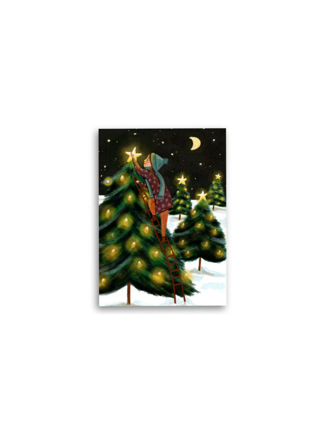 Een leuke kerstkaart van een meisje dat een kerstboom aan het versieren is van Esther Bennink
