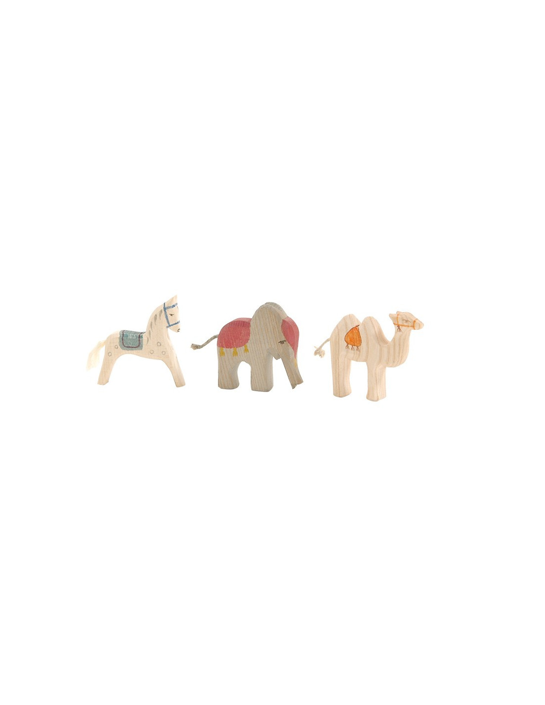 Vul je mini kerststal aan met deze set met 3 kleine handgesneden dieren van Ostheimer. De set bestaat uit een wit paard met blauwe teugels en kleed, een kameel met oranje teugels en kleed en een olifant met rood kleed. De dieren passen zeer goed bij bijvoorbeeld de mini koningen maar kunnen uiteraard ook los als speelgoed gebruikt worden. Daarnaast wordt de set geleverd in een stevig houten bewaarframe met plexiglas schuifdeksel zodat je hem goed kan opbergen als de kerst weer voorbij is.