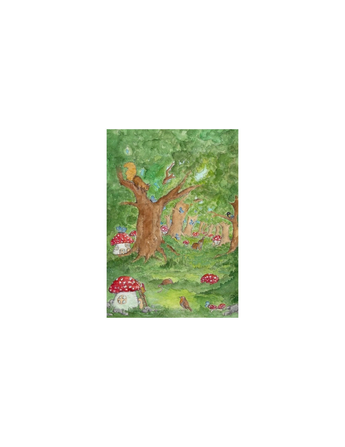 Een vrolijke ansichtkaart met een paddestoelen bos in de lente van Margo Heine